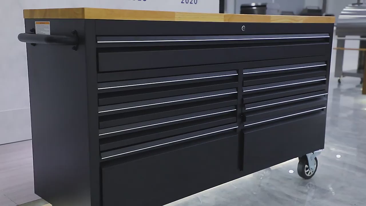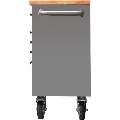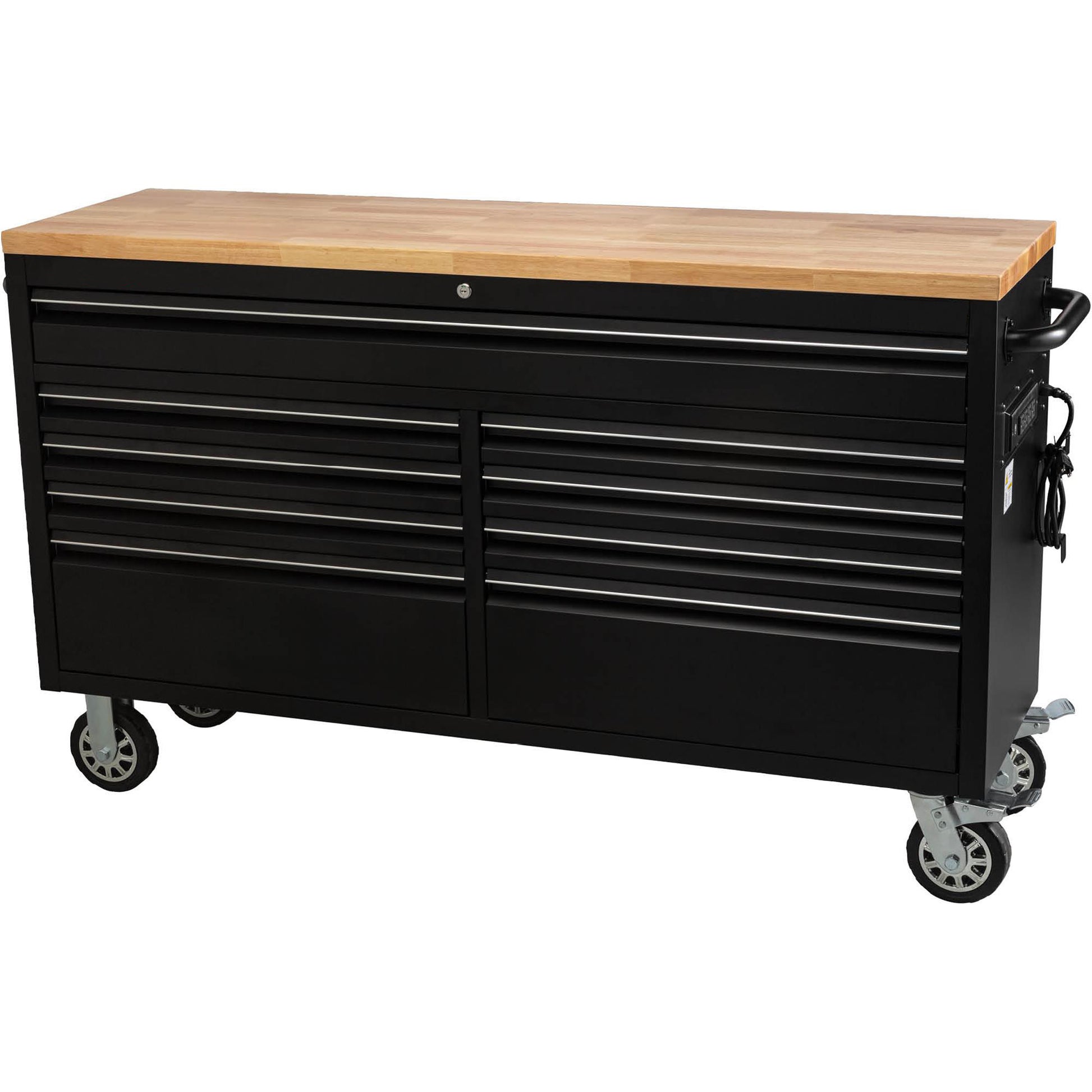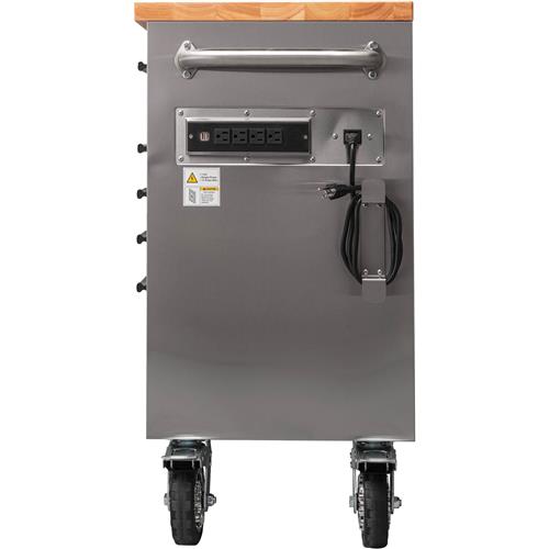 Keep your tools organized and your workspace efficient with this heavy-duty 61” tool chest. Designed with durability and functionality in mind, it features smooth-gliding drawers, a sturdy rubber wood top, and a convenient built-in power strip for all your workshop needs. Available in Stainless Steel or Black Powder-Coated finish.