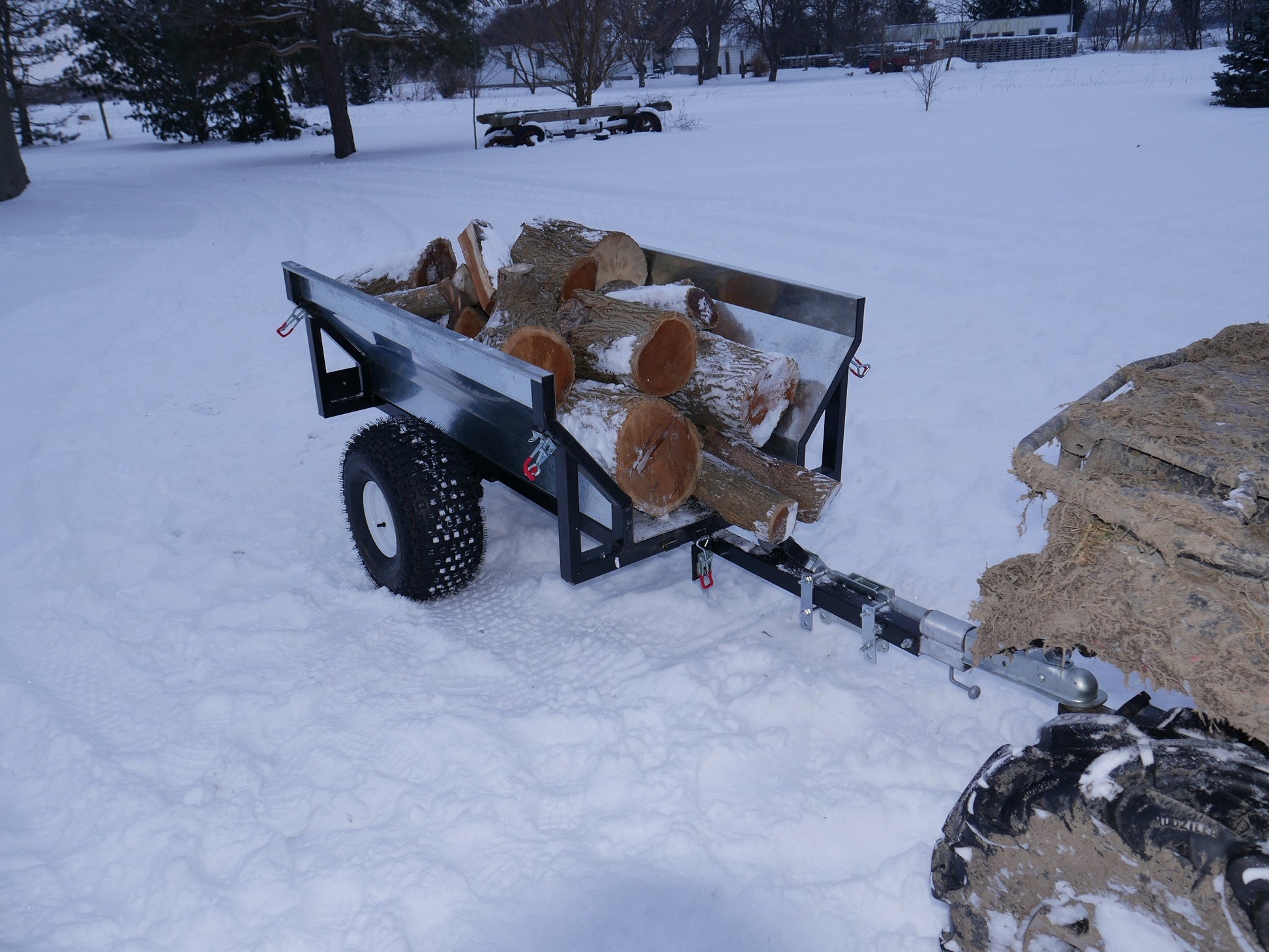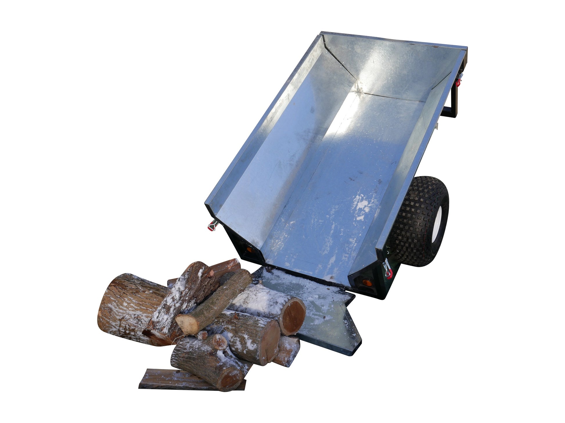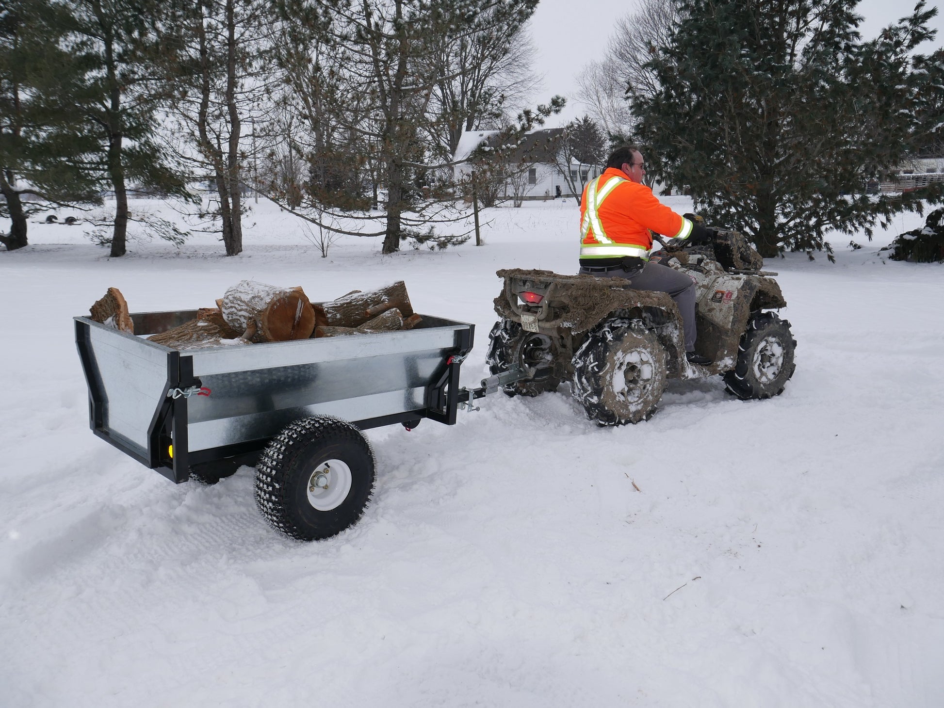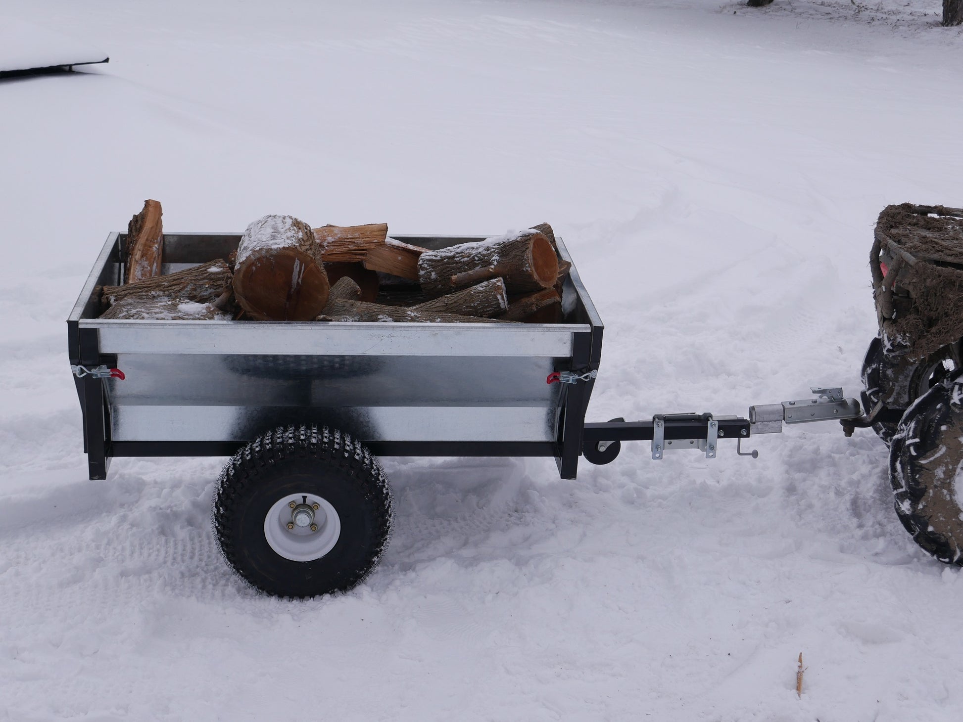 I am impressed with this steel atv that I had to write a review. We live on 15 acres so I'm always hauling something mainly firewood and brush. I love everything about this The tires are big and ride over stones and logs smoothly with no bouncing. It's got a nice long rotating tongue so the atv rides independently of the trailer which is amazing . I've had it fully loaded on a sideways steep hill and I haven't tipped it over yet. It dumps easily even when fully loaded. If you have a 4 wheeler you will love this thing!