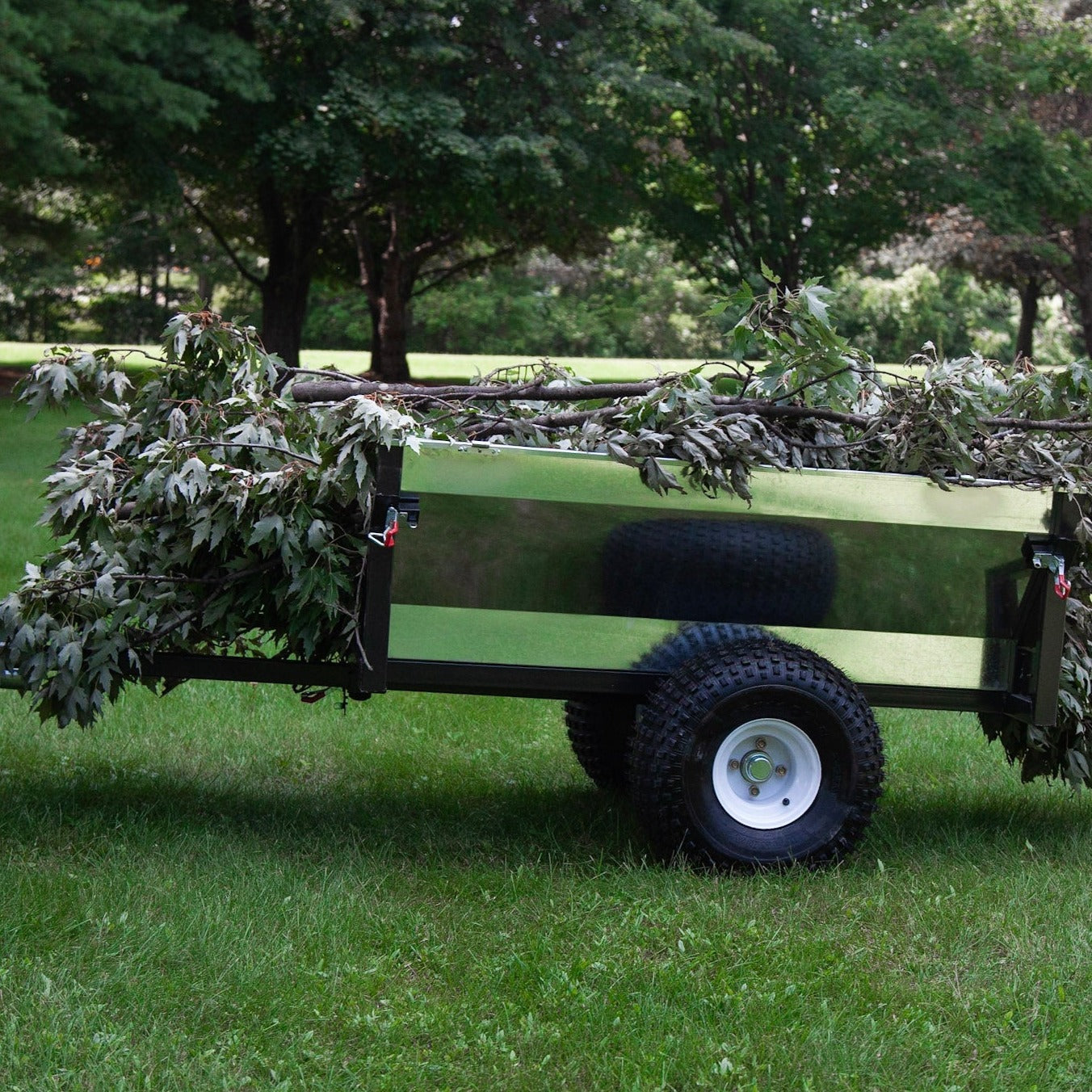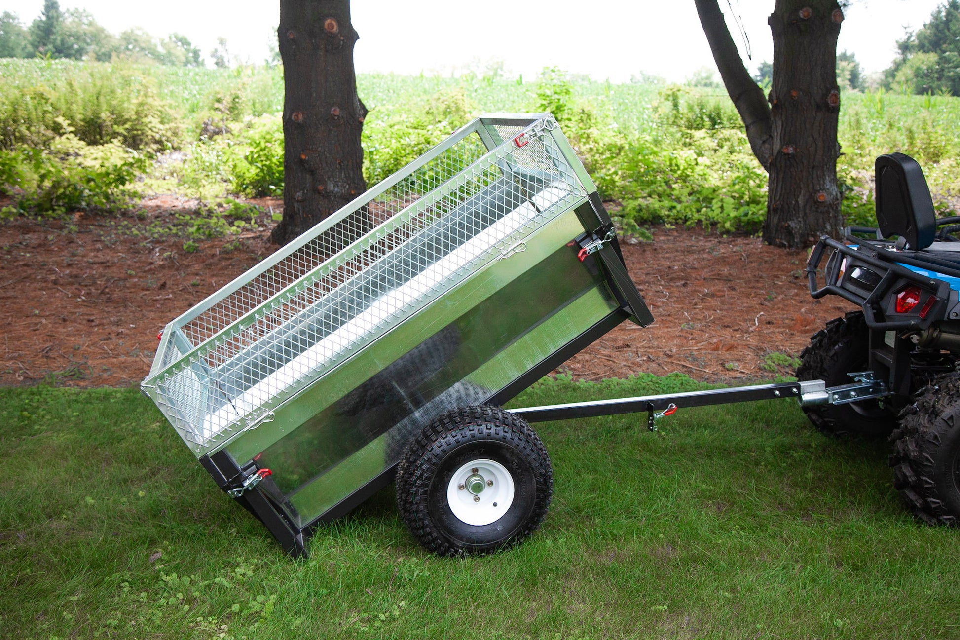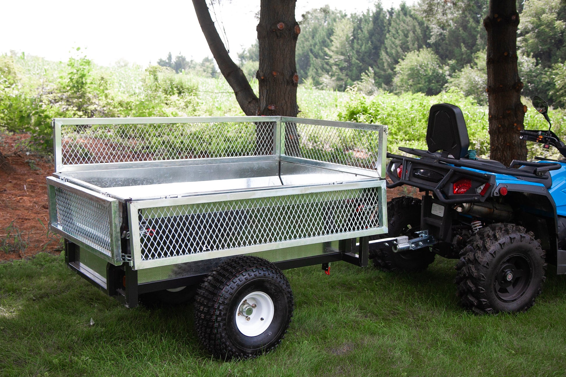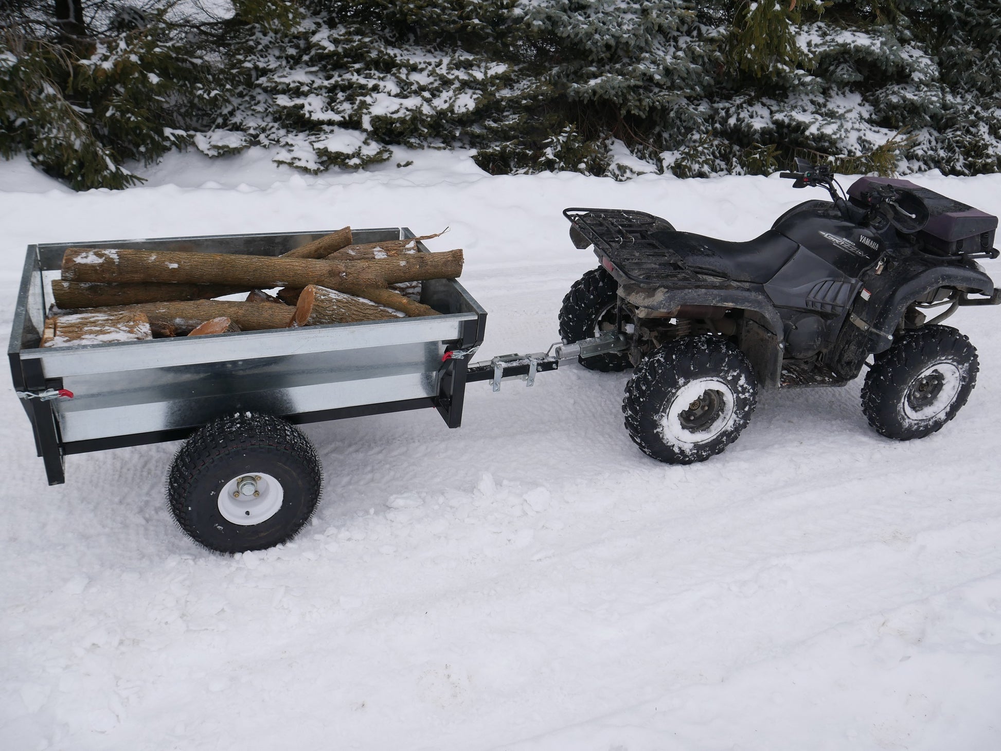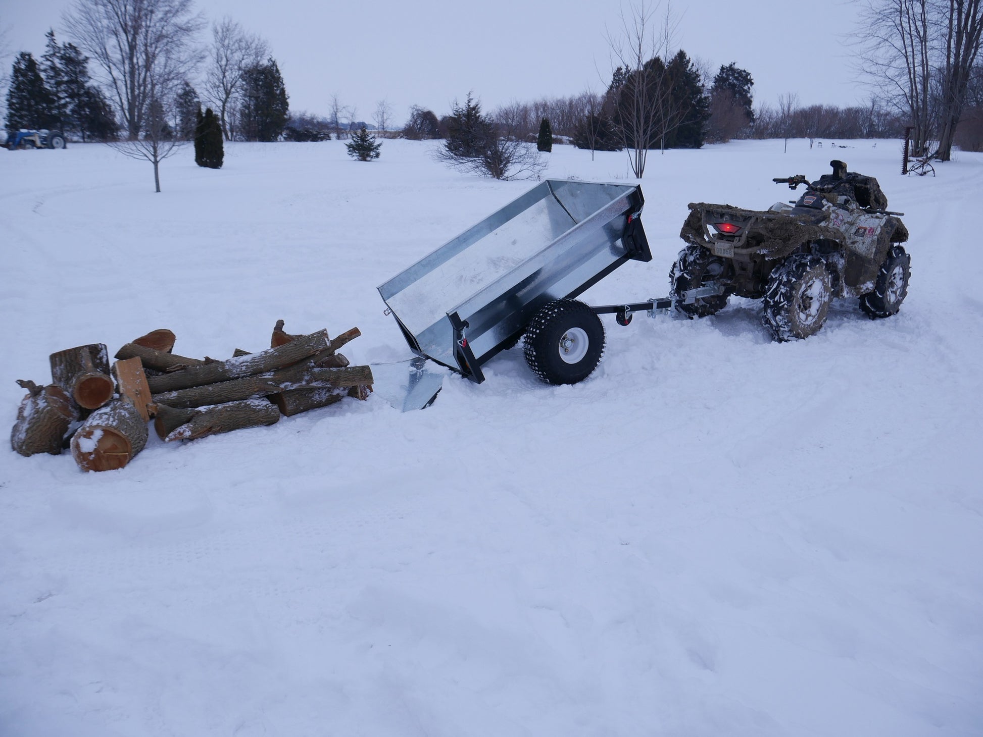 I am impressed with this steel atv that I had to write a review. We live on 15 acres so I'm always hauling something mainly firewood and brush. I love everything about this The tires are big and ride over stones and logs smoothly with no bouncing. It's got a nice long rotating tongue so the atv rides independently of the trailer which is amazing . I've had it fully loaded on a sideways steep hill and I haven't tipped it over yet. It dumps easily even when fully loaded. If you have a 4 wheeler you will love this thing!