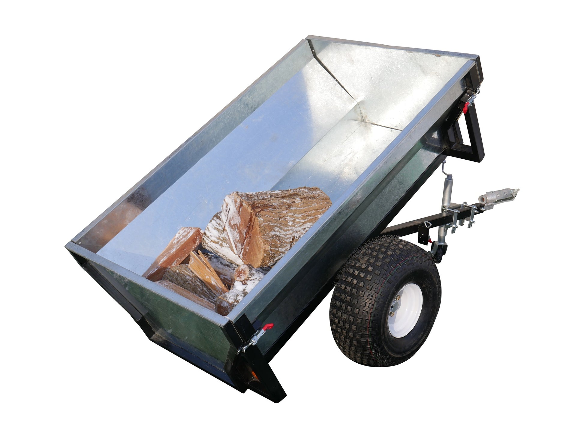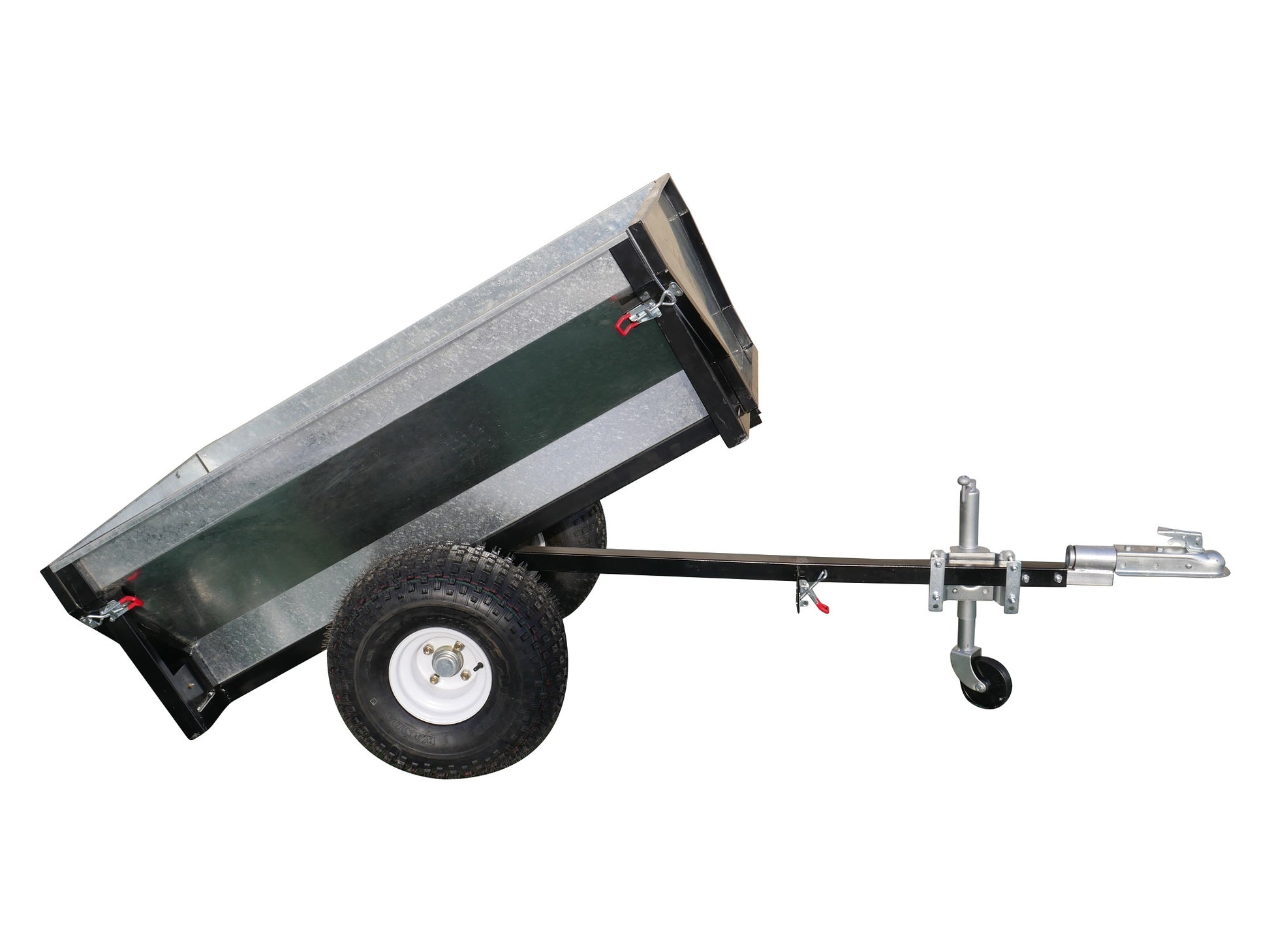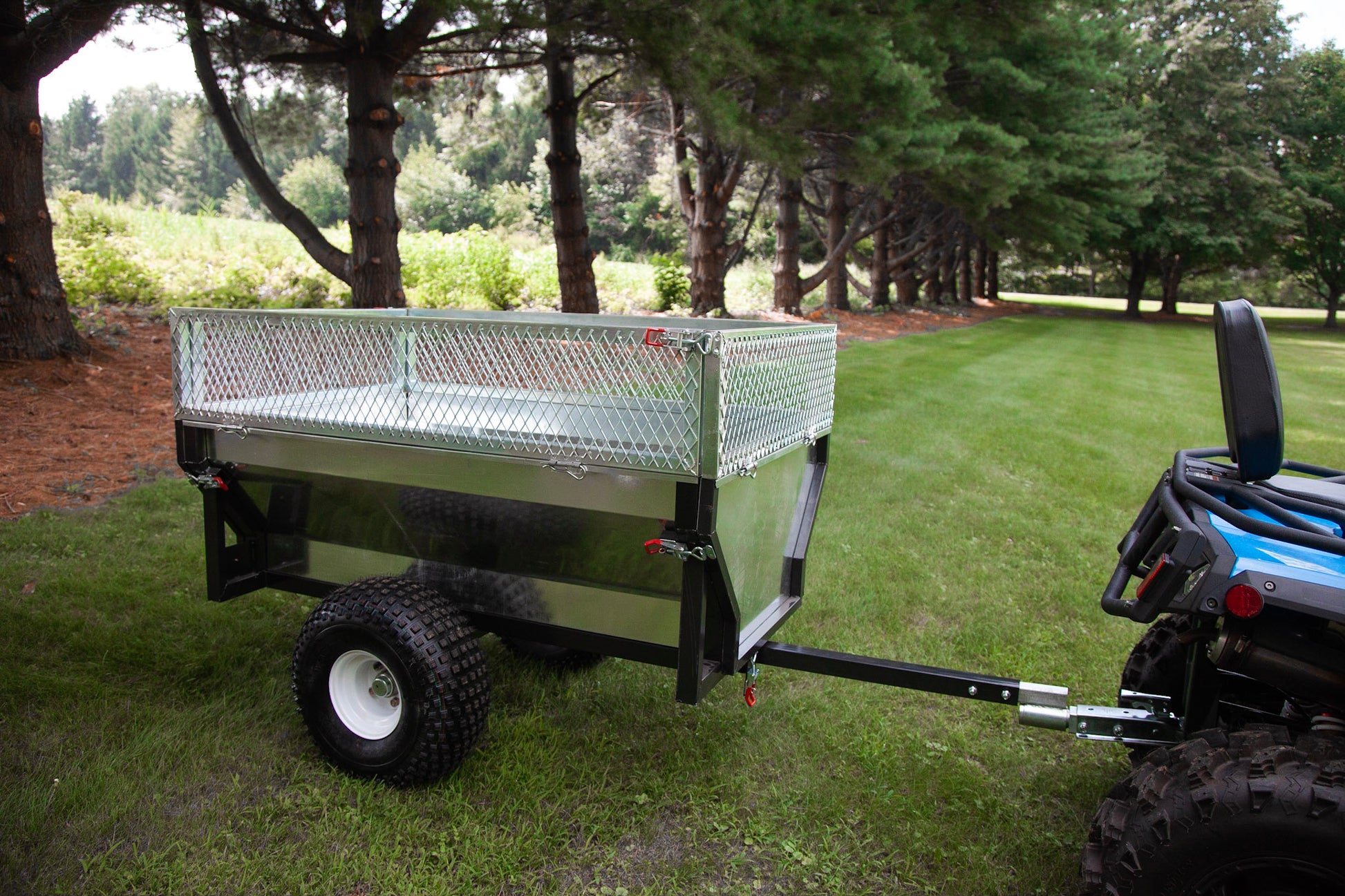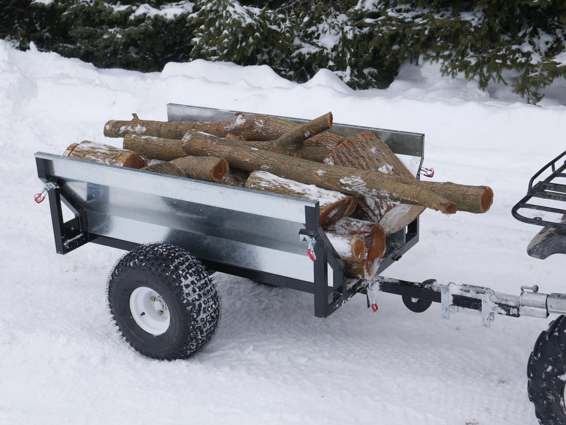 I am impressed with this steel atv that I had to write a review. We live on 15 acres so I'm always hauling something mainly firewood and brush. I love everything about this The tires are big and ride over stones and logs smoothly with no bouncing. It's got a nice long rotating tongue so the atv rides independently of the trailer which is amazing . I've had it fully loaded on a sideways steep hill and I haven't tipped it over yet. It dumps easily even when fully loaded. If you have a 4 wheeler you will love this thing!