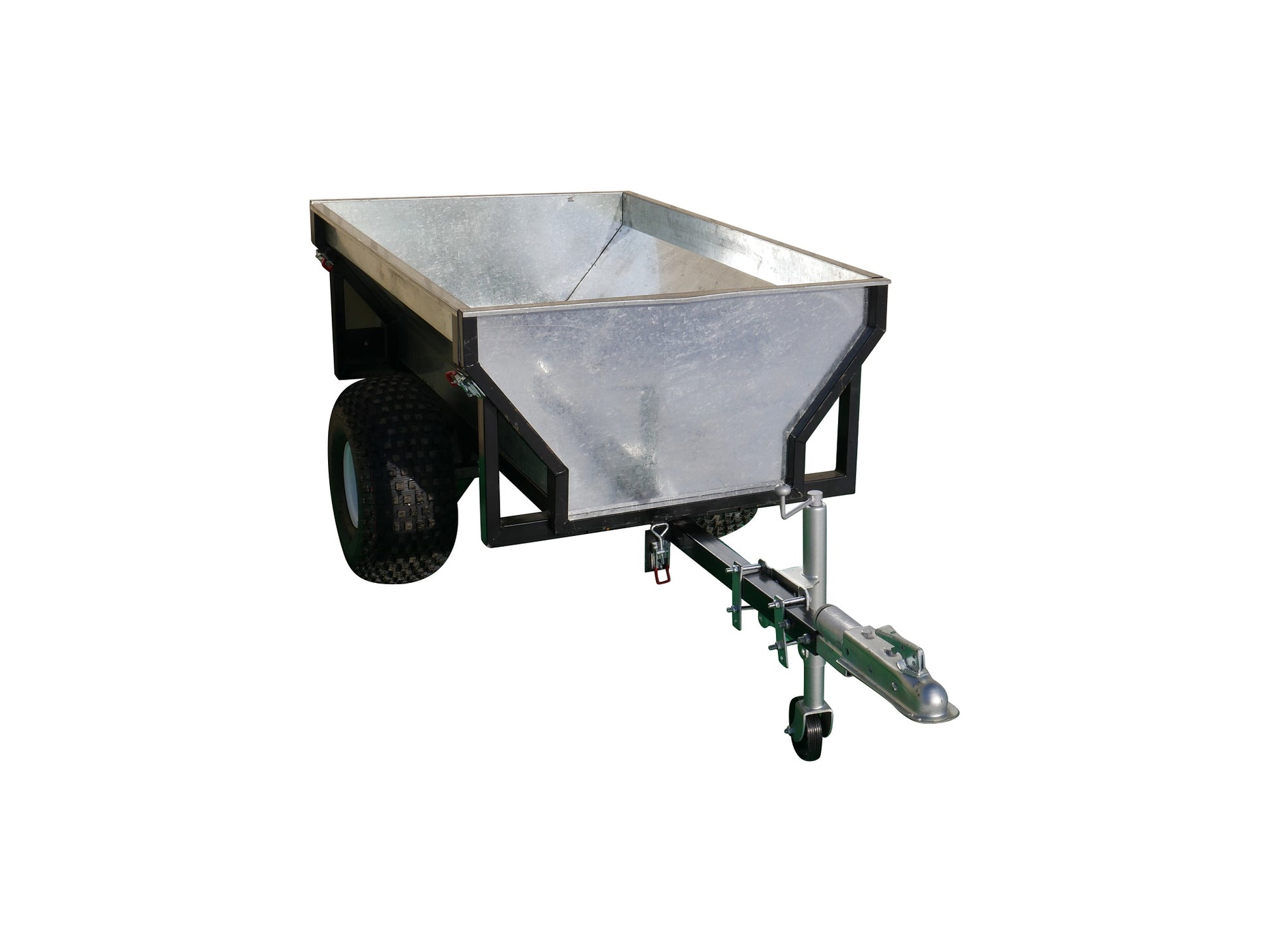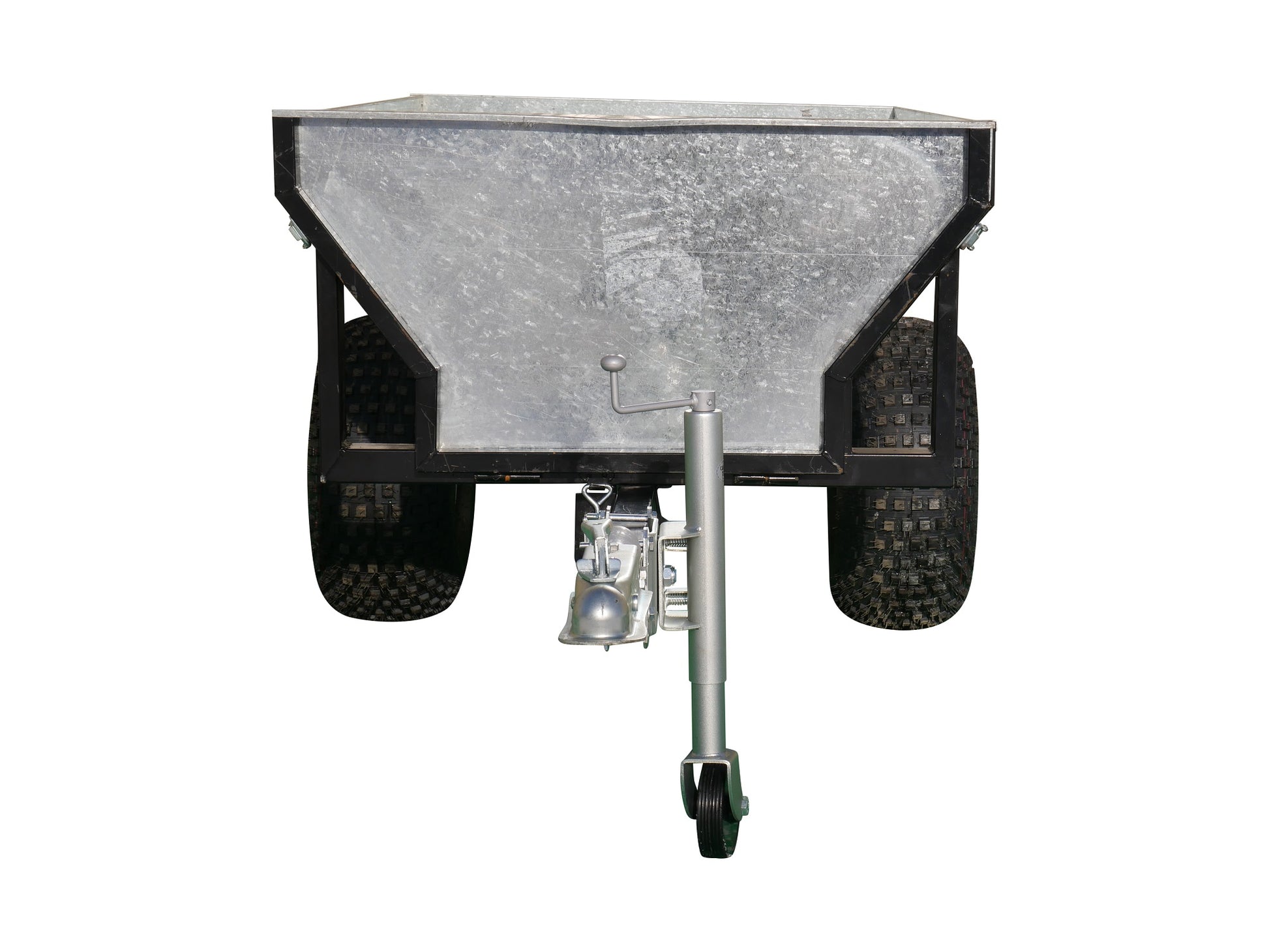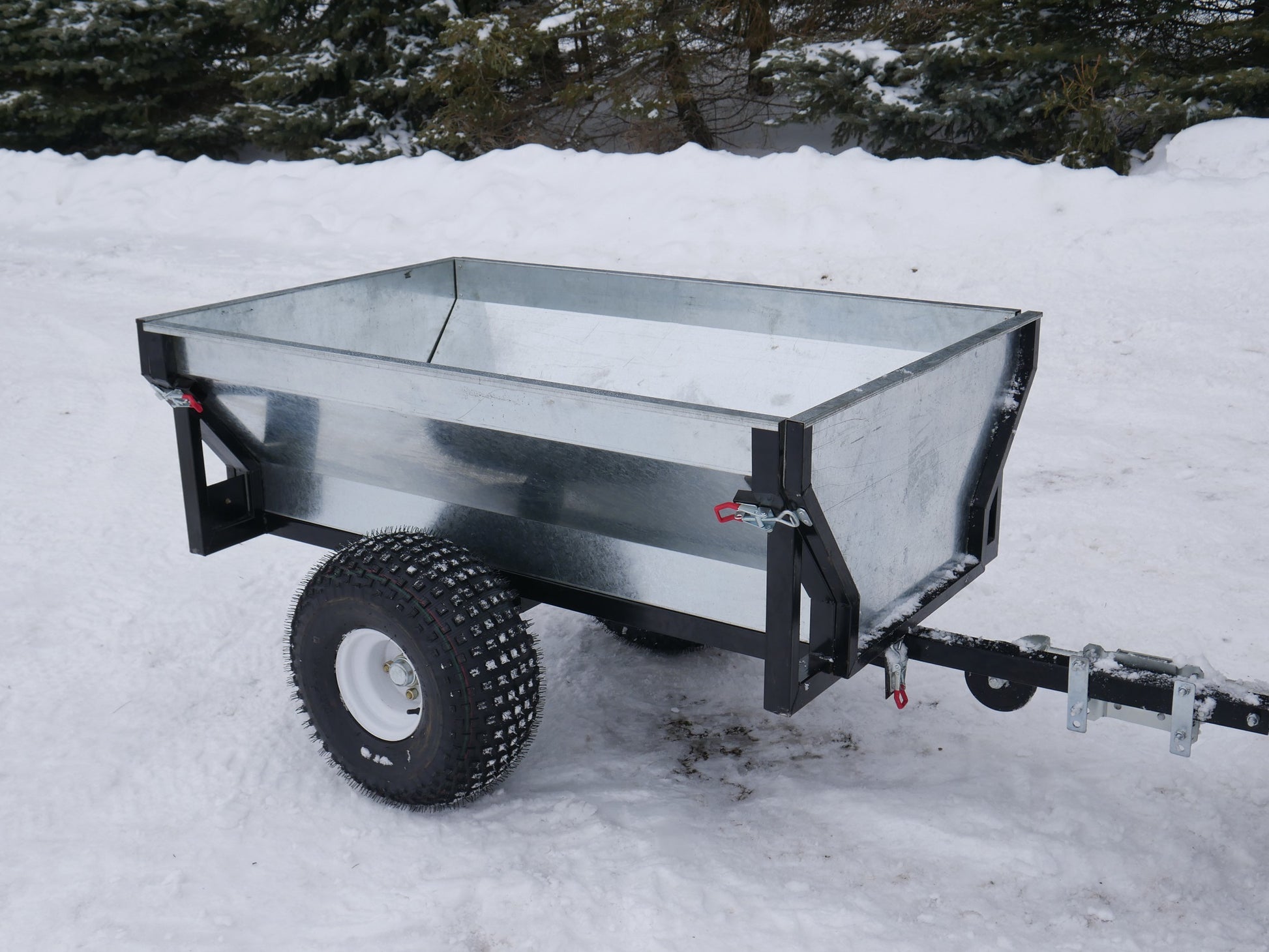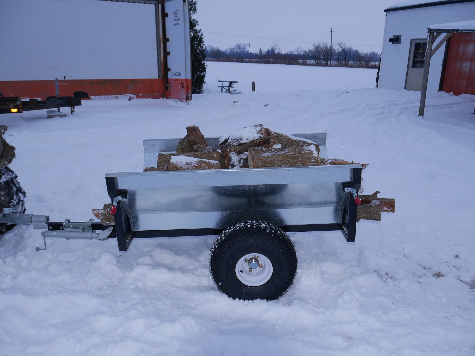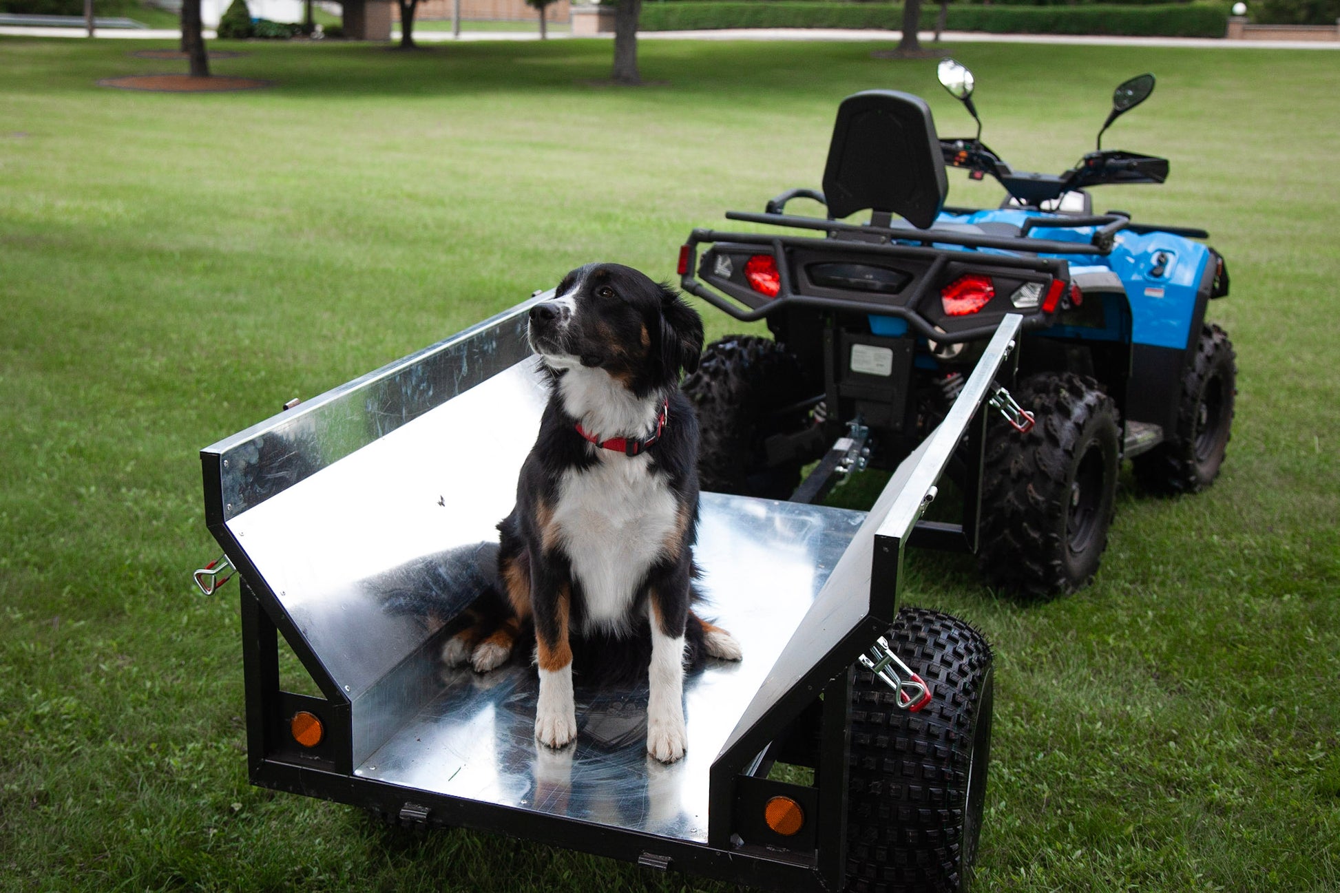 I am impressed with this steel atv that I had to write a review. We live on 15 acres so I'm always hauling something mainly firewood and brush. I love everything about this The tires are big and ride over stones and logs smoothly with no bouncing. It's got a nice long rotating tongue so the atv rides independently of the trailer which is amazing . I've had it fully loaded on a sideways steep hill and I haven't tipped it over yet. It dumps easily even when fully loaded. If you have a 4 wheeler you will love this thing!