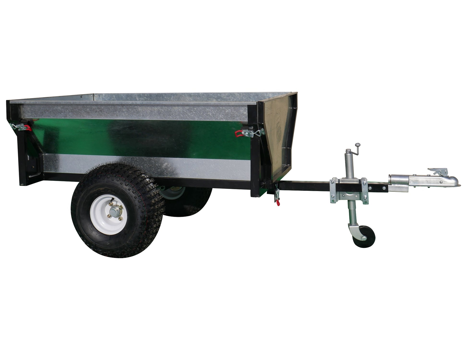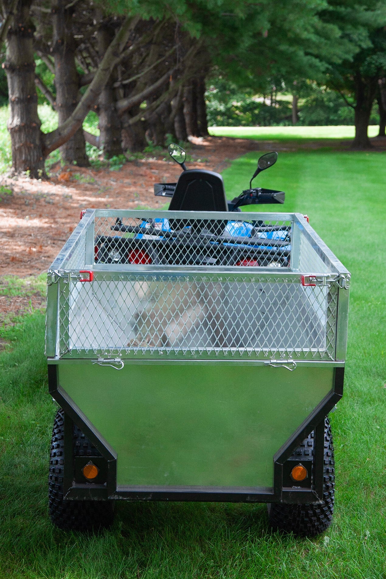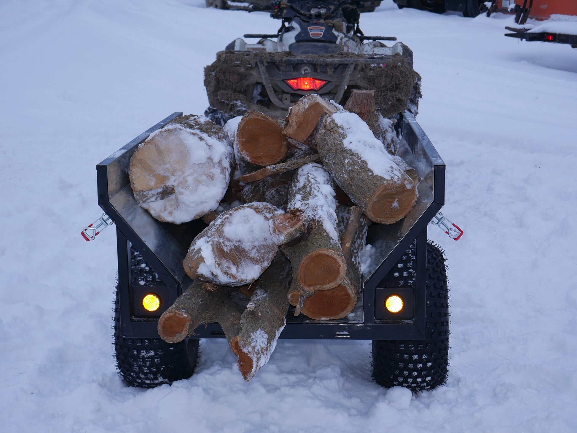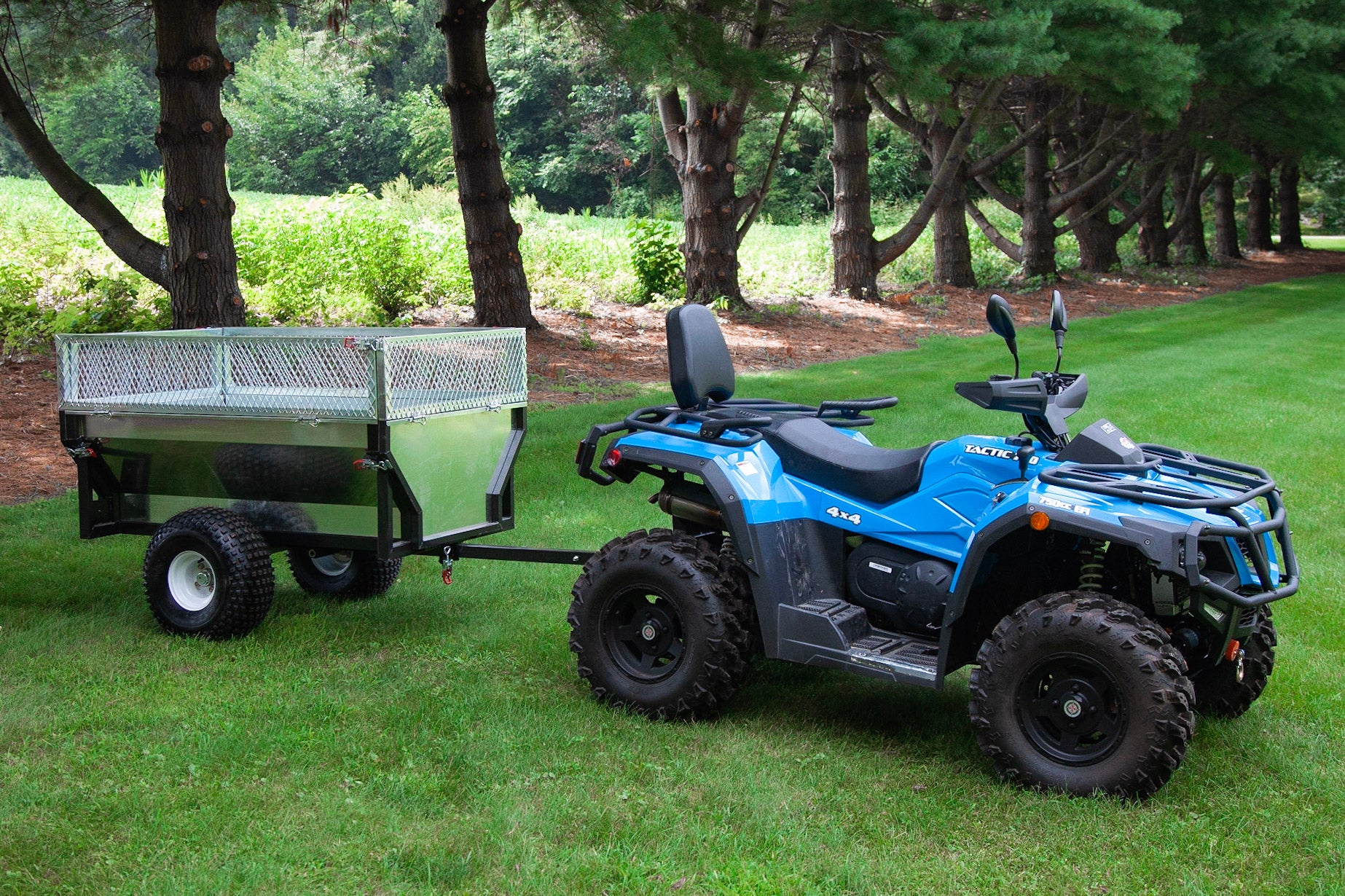 I am impressed with this steel atv that I had to write a review. We live on 15 acres so I'm always hauling something mainly firewood and brush. I love everything about this The tires are big and ride over stones and logs smoothly with no bouncing. It's got a nice long rotating tongue so the atv rides independently of the trailer which is amazing . I've had it fully loaded on a sideways steep hill and I haven't tipped it over yet. It dumps easily even when fully loaded. If you have a 4 wheeler you will love this thing!