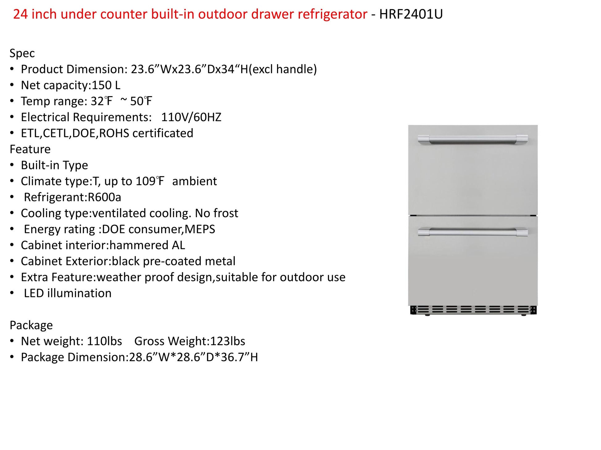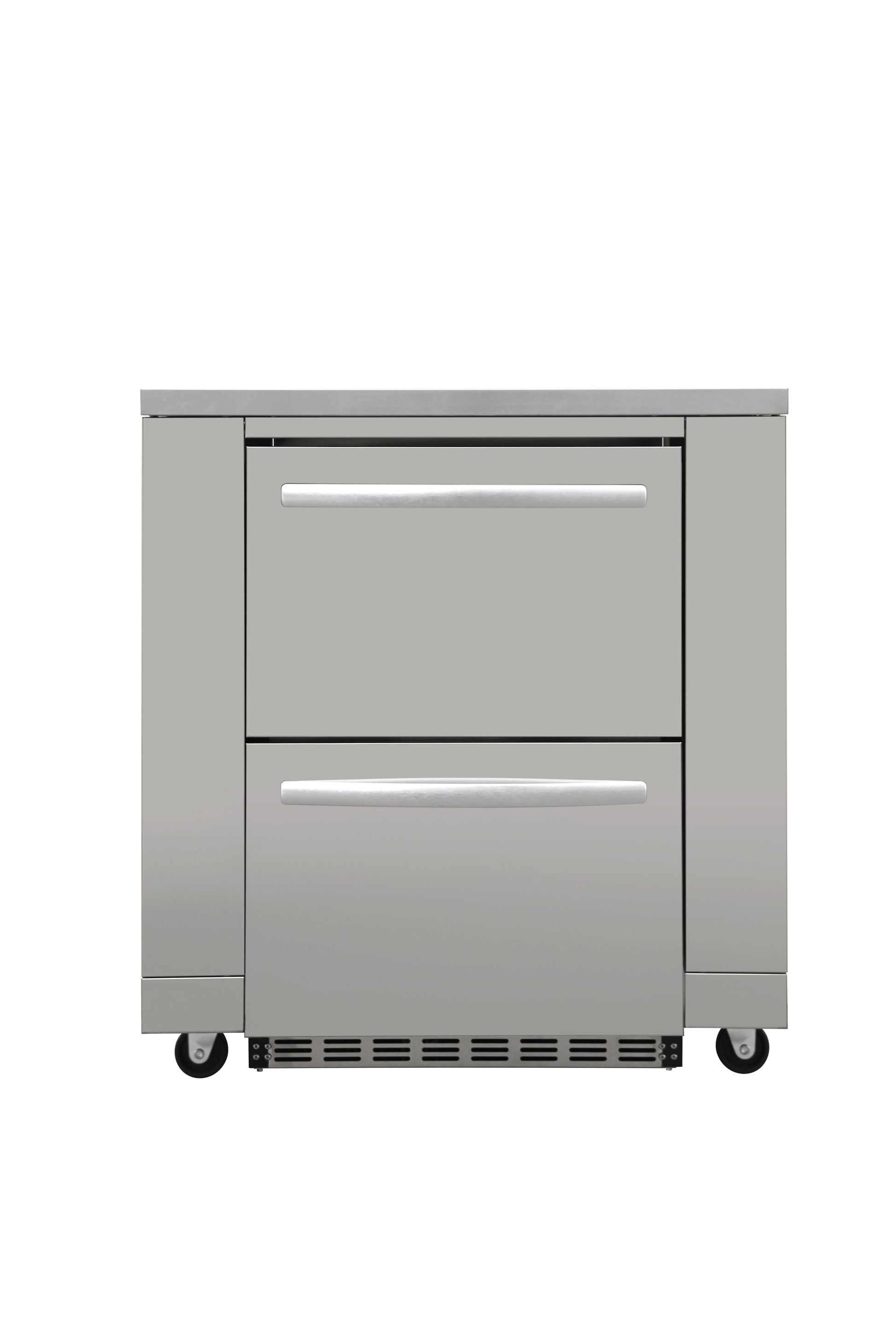 The 24-inch Indoor/Outdoor Refrigerator Drawers feature a ventilated cooling system and no-frost design that automatically defrosts the evaporator to maintain uniform cooling and prevent humidity and freezing. The Appliance Cabinet features casters with brakes and fits any 24-inch under counter unit from THOR, such as its refrigerator drawers or outdoor wine coolers.