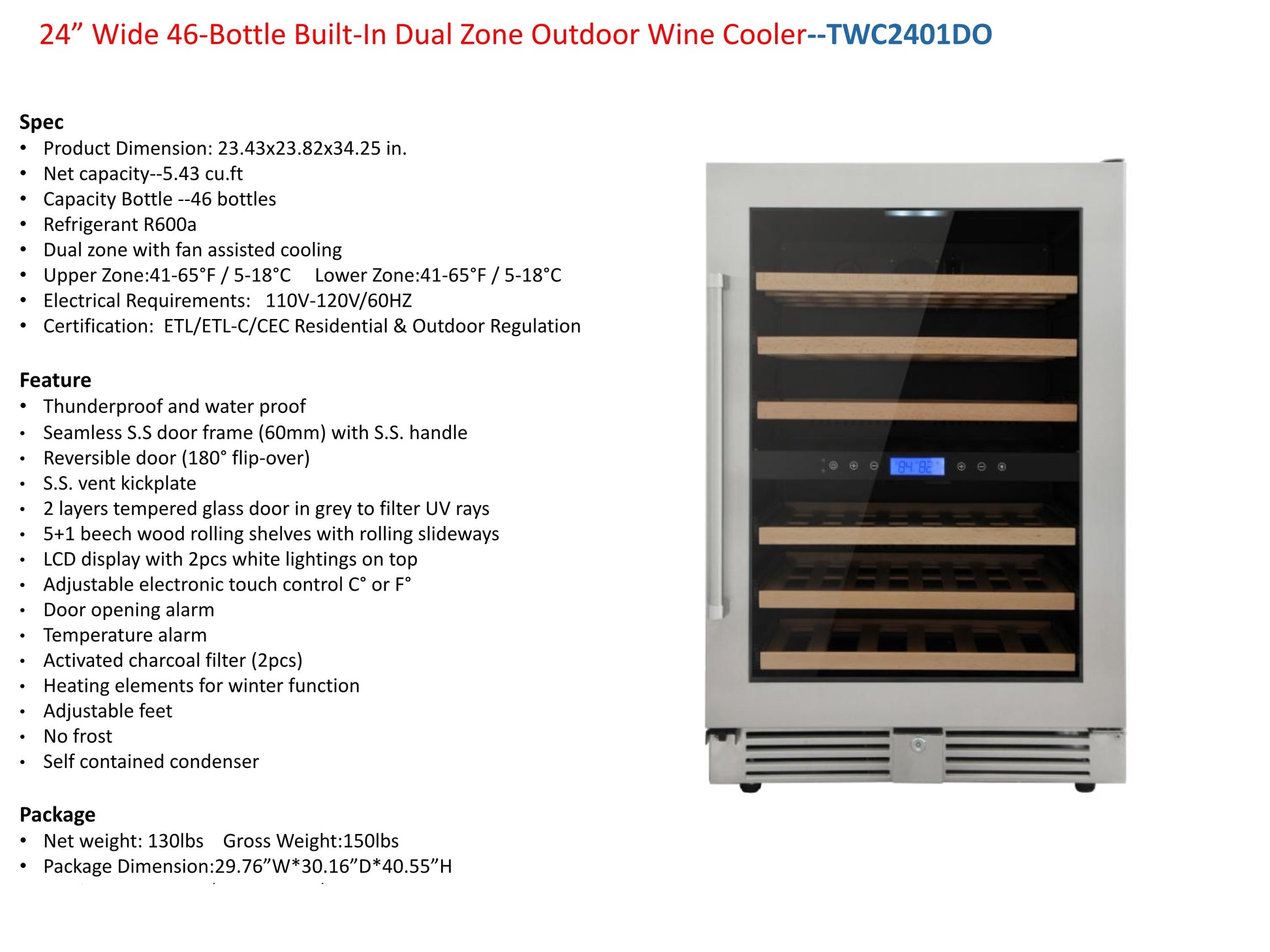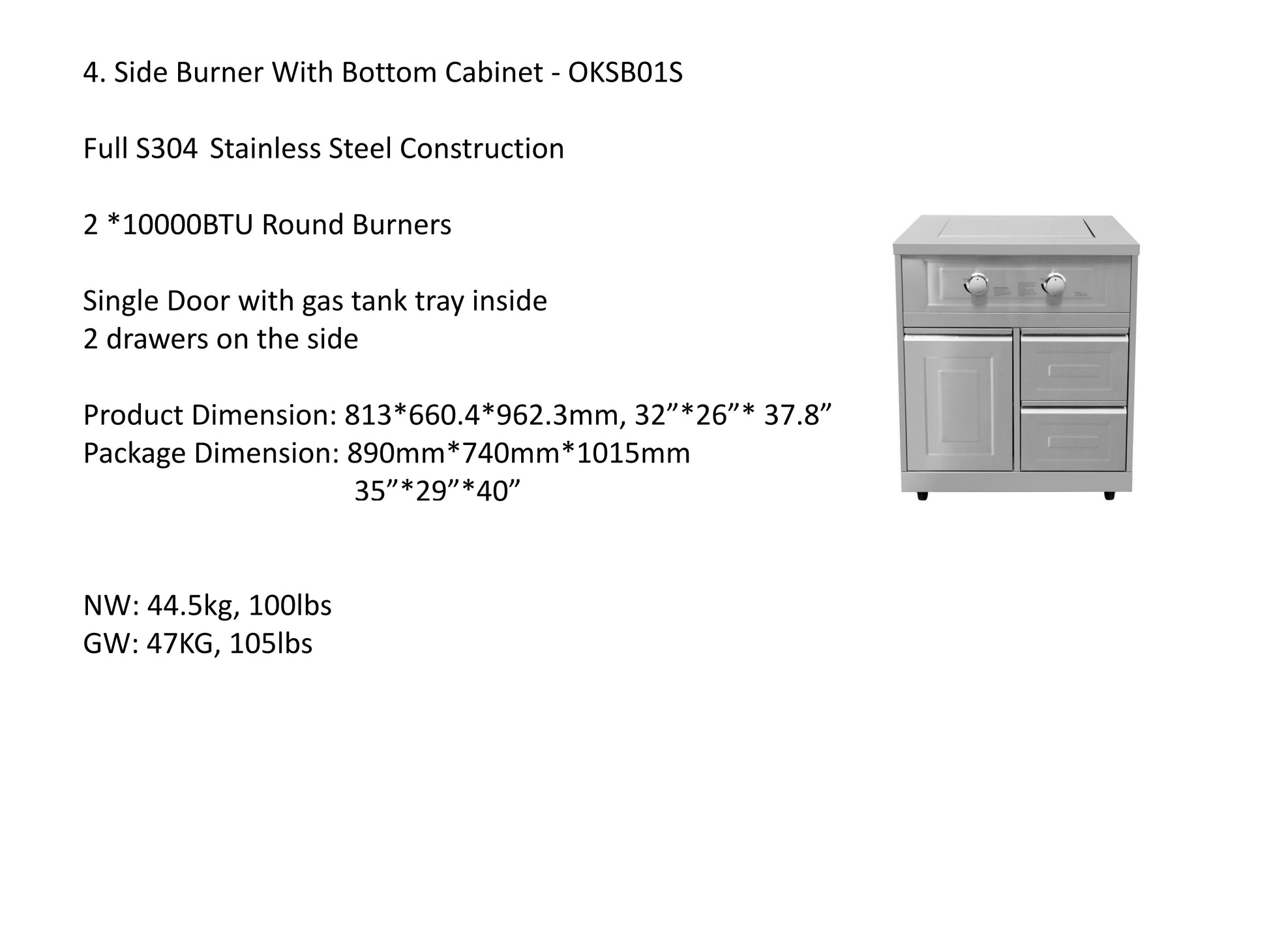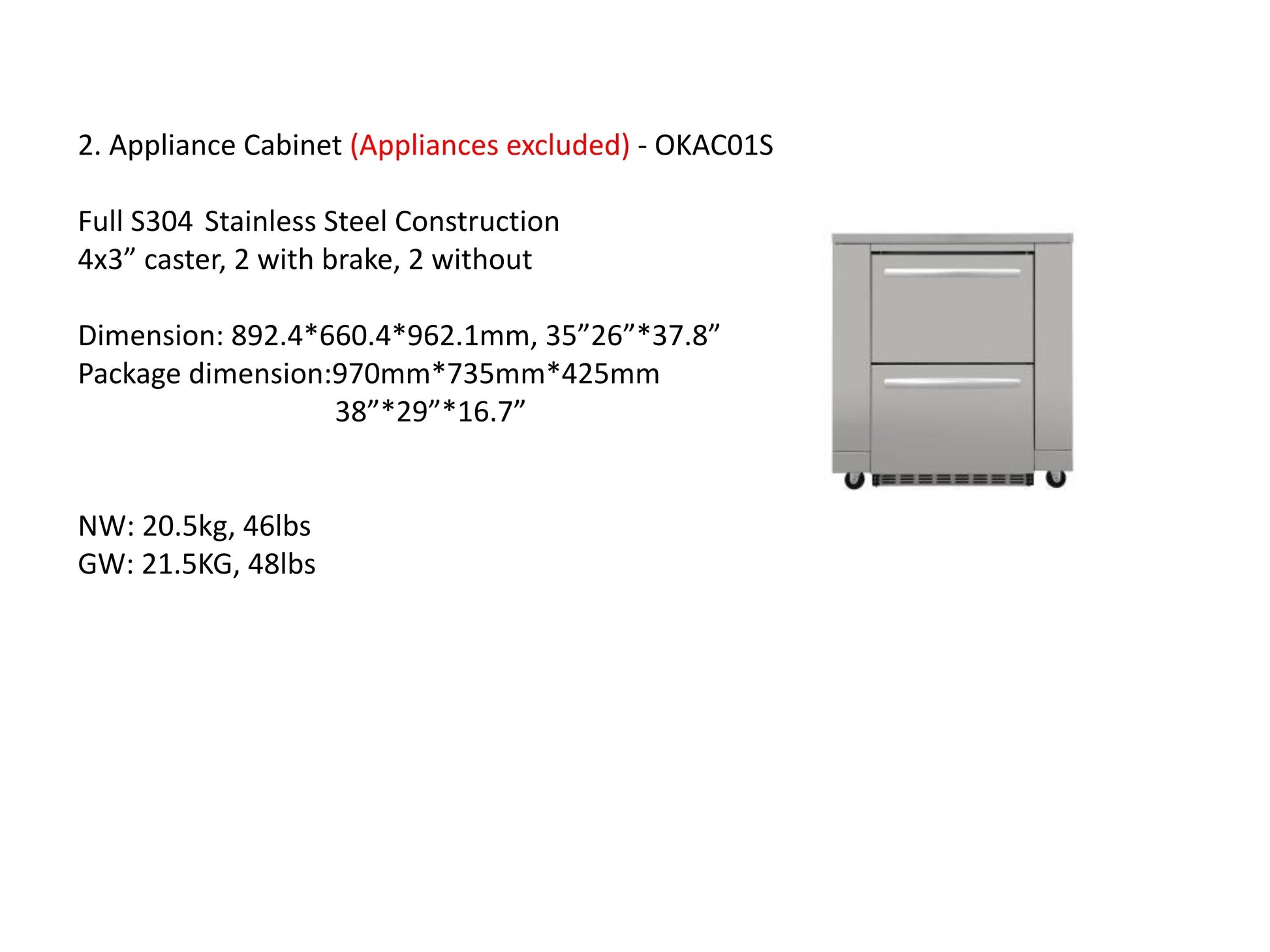 The new 8-piece Modular Kitchen Suite includes: 24-inch Indoor/Outdoor Refrigerator Drawers Pizza Oven Side Burner with Bottom Cabinet Grill , Grill Cabinet , Sink Cabinet , Corner Cabinet and Appliance Cabinet These products are all Electrical Testing Laboratories (ETL) rated for outdoor use and feature 304 stainless steel to resist rust, ensure longevity and is easy to clean.