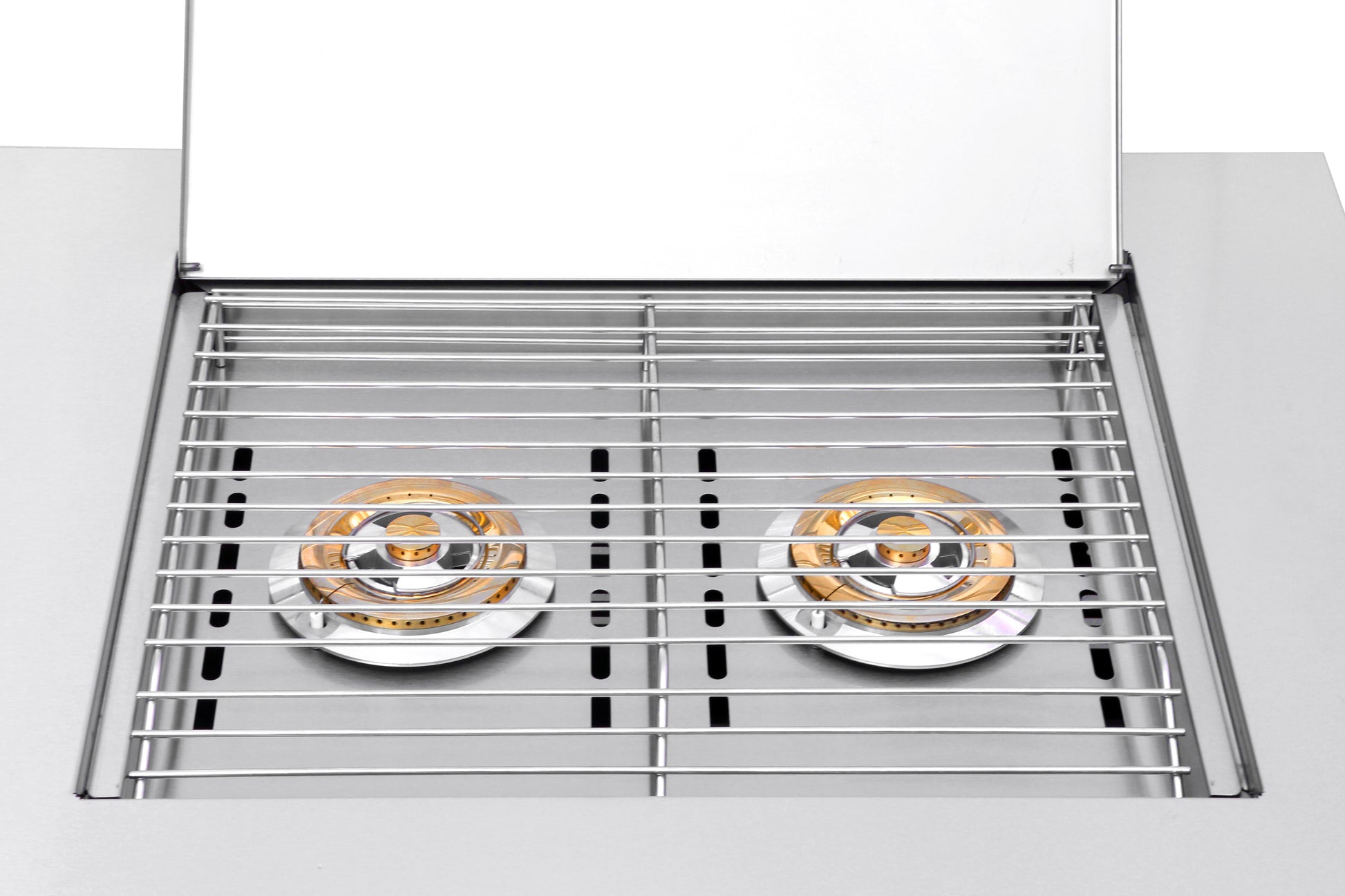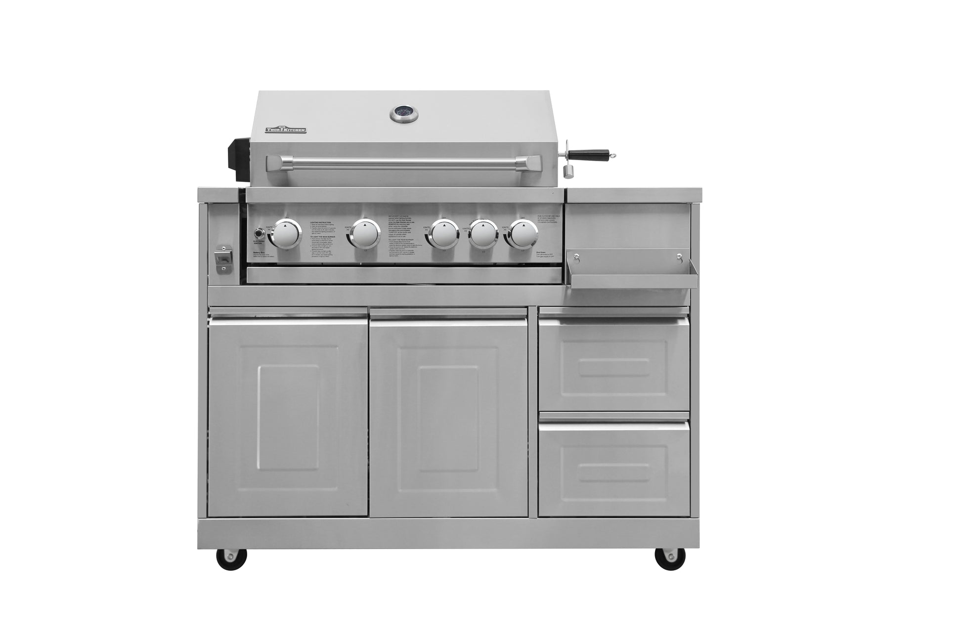 The Grill with Grill Cabinet features a rotisserie, four 12,000 BTU tube burners and one 10,000 BTU infrared burner – and the classic wood-burning Pizza Oven includes a commercial grade refractory brick hearth design. The Sink Cabinet includes a faucet and sink, spice rack, bottle opener and additional storage space, while the Side Burner with Bottom Cabinet features two 10,000 BTU burners and double drawers. For additional storage, the Corner Cabinet brings the suite together as the corner piece where different layouts pivot.